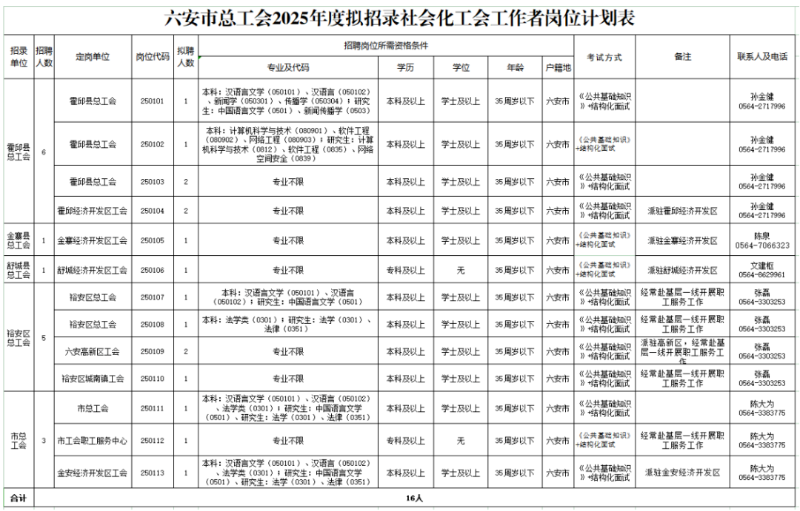 本次计划招聘16名社会化工会工作者:霍邱县总工会6人;金寨县总工会1人;舒城县总工会1人;裕安区总工会5人;市总工会3人。招聘公告在六安市人事考试信息网(www.lapta.cn)、六安市总工会官网(www.laszgh.org)统一发布。具体招聘岗位、条件等详见附件1。