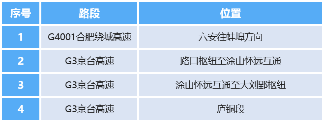 受大流量冲击影响,预计全省高速公路部分路段、节点高峰时段将会出现拥堵缓行。其中,宁洛高速蚌埠段、沪武高速马鞍山段、沪陕高速合六叶段、芜合高速巢湖段、沪渝高速铜陵段、杭瑞高速黄山段、滁新高速淮南段、盐洛高速宿州段等8处东西向通道,受单向车流集中影响高峰时段易发生拥堵缓行。沪武高速马鞍山长江大桥、芜合高速芜湖长江大桥、京台高速铜陵长江大桥、德上高速池州长江大桥、沪渝高速安庆长江大桥等5处过江通道易成为拥堵节点。京台-盐洛高速宿州、京台-宁洛高速大刘郢、蚌合-滁新高速长丰、蚌合-沪陕高速合肥西、德上-宁信高速保义、芜合-沪武高速马鞍山西、合安-沪渝高速鸽子墩、沪渝-沪武高速钟鸣、溧宁-杭瑞高速呈村降、宣桐-溧宁高速河沥溪等10个枢纽受车流交织冲突影响高峰时段易发生拥堵缓行。宁洛高速林东半岛、嘉山,滁新高速八公山、阜南,蚌合高速龙门寺,沪武高速清溪、白帽,沪渝高速寒亭等8个服务区,以及合肥、滁州、芜湖、马鞍山等城市周边11个收费站易出现车辆入口排队现象。