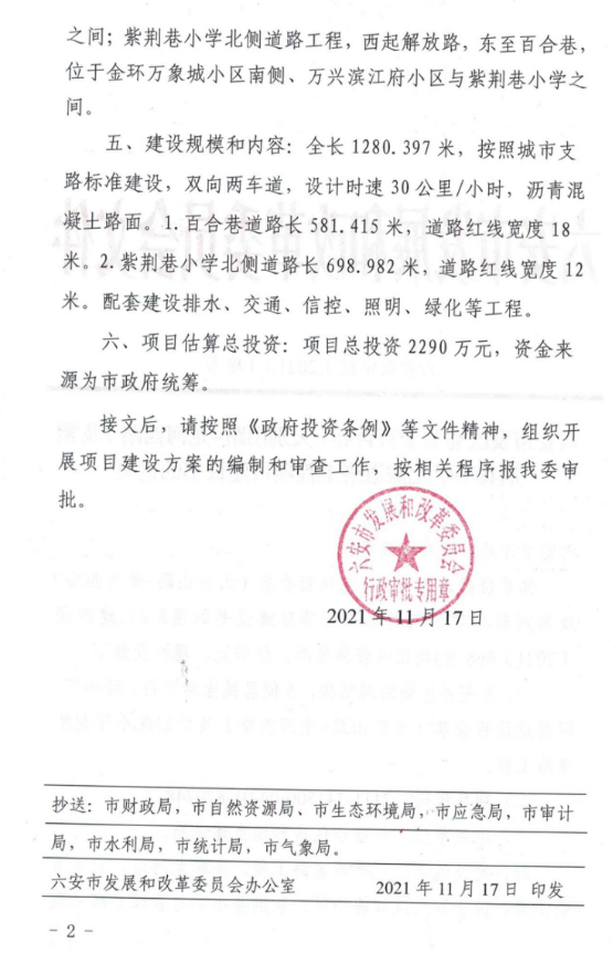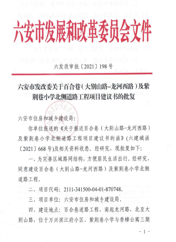 关于百合巷(大别山路-龙河西路)及紫荆巷小学北侧路道路工程项目建议书的批复