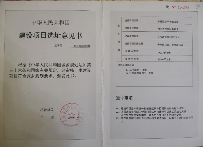 赤壁路小学建设工程建设项目选址意见书