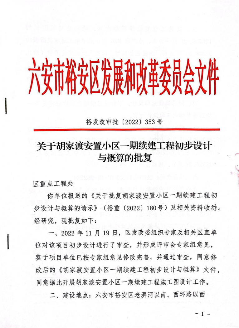 胡家渡安置小区一期续建工程初步设计与概算的批复