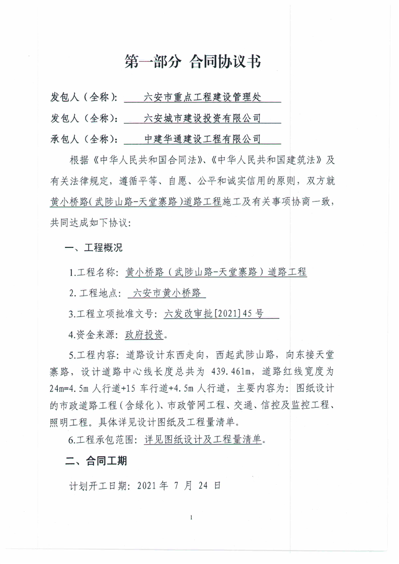 黄小桥路(武陟山路-天堂寨路)道路建设工程施工合同