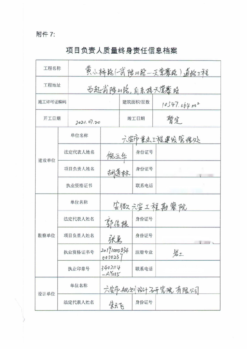 黄小桥路(武陟山路-天堂寨路)道路项目负责人质量终身责任信息档案