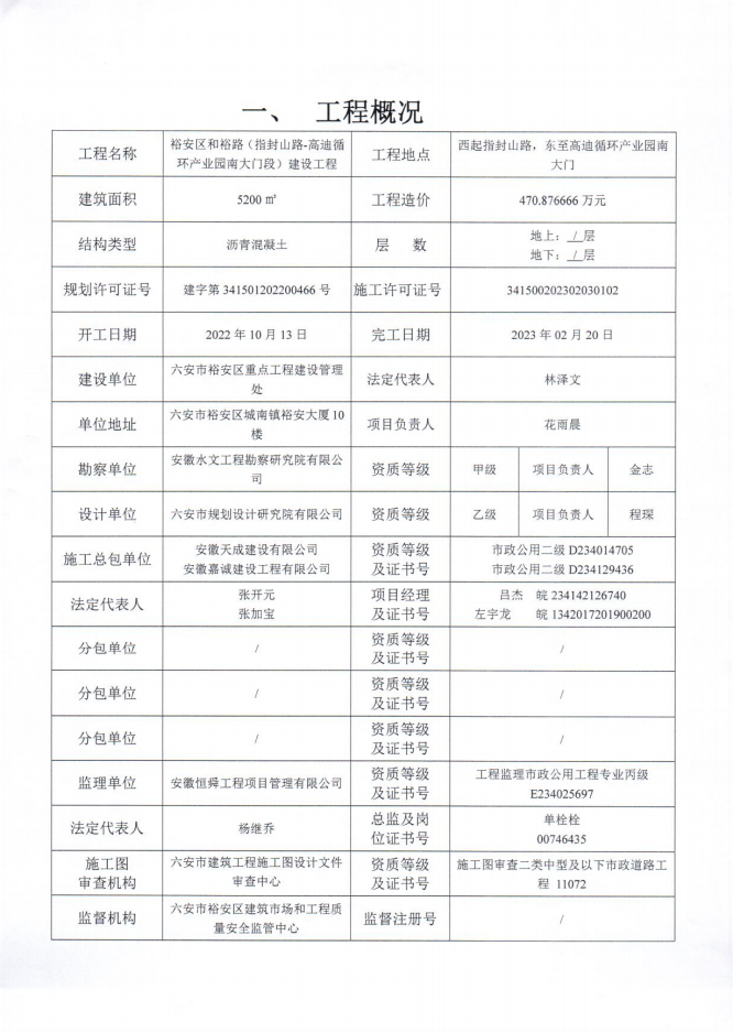 和裕路(指封山路-高迪循环产业园南大门段)建设工程竣工验收报告