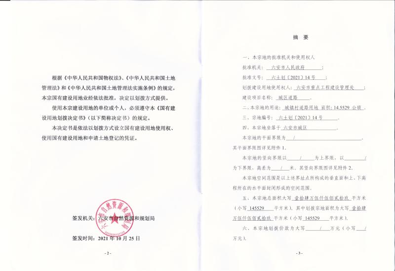 解放南路(大别山路-佛子岭路)改造工程建设用地划拨决定书