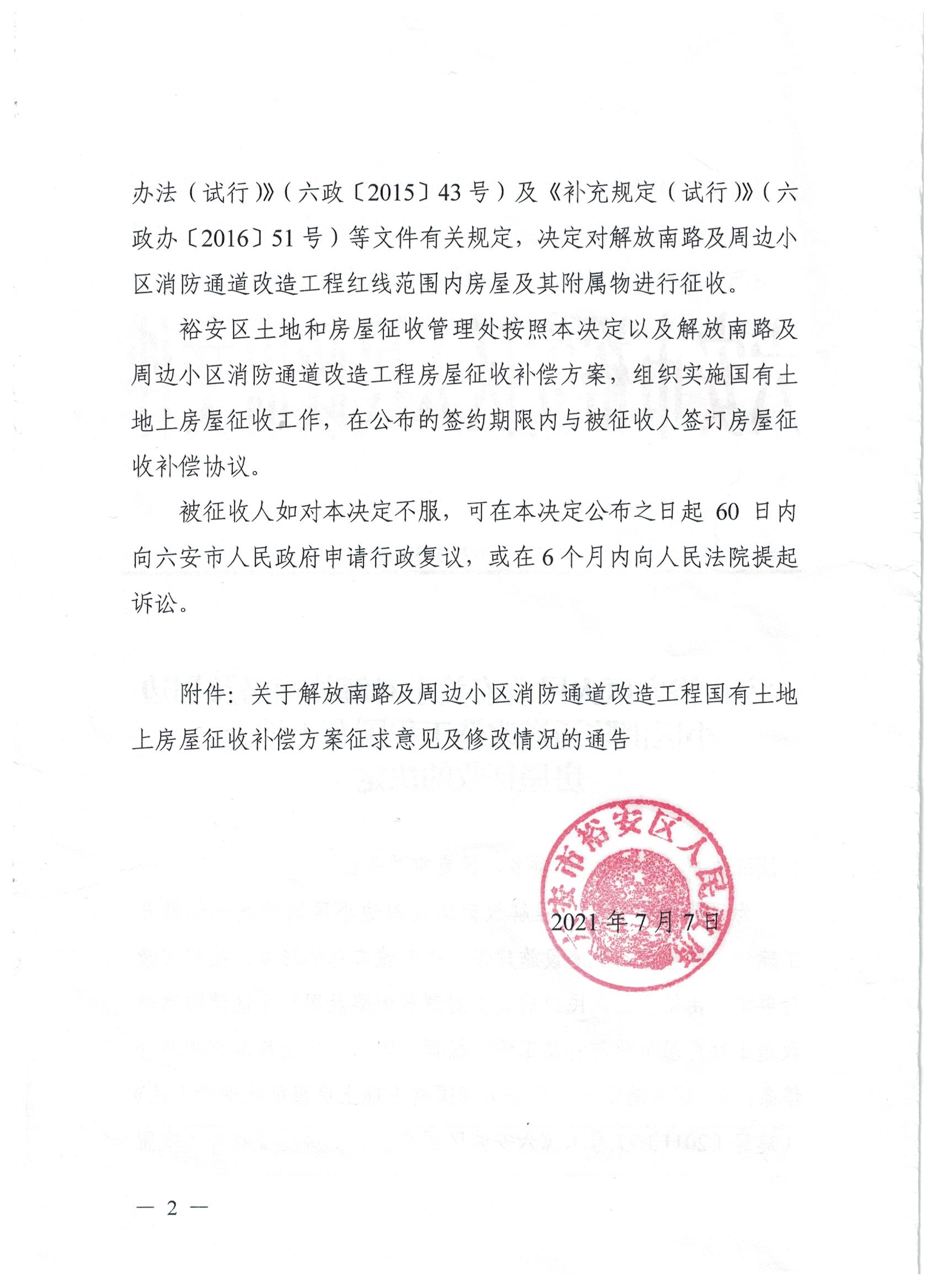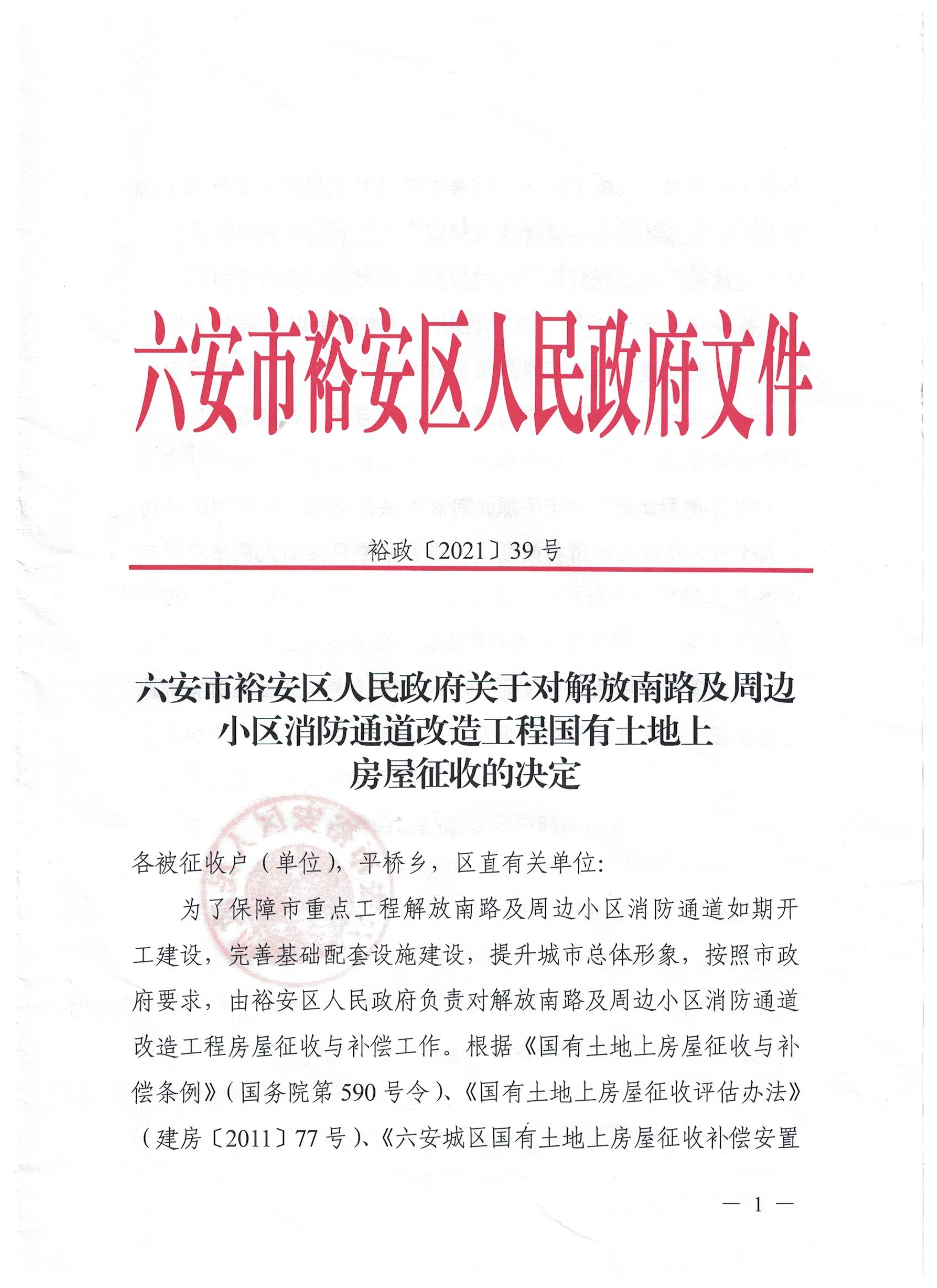 六安市裕安区k8凯发关于对解放南路及周边小区消防通道改造工程国有土地上房屋征收的决定