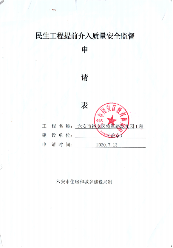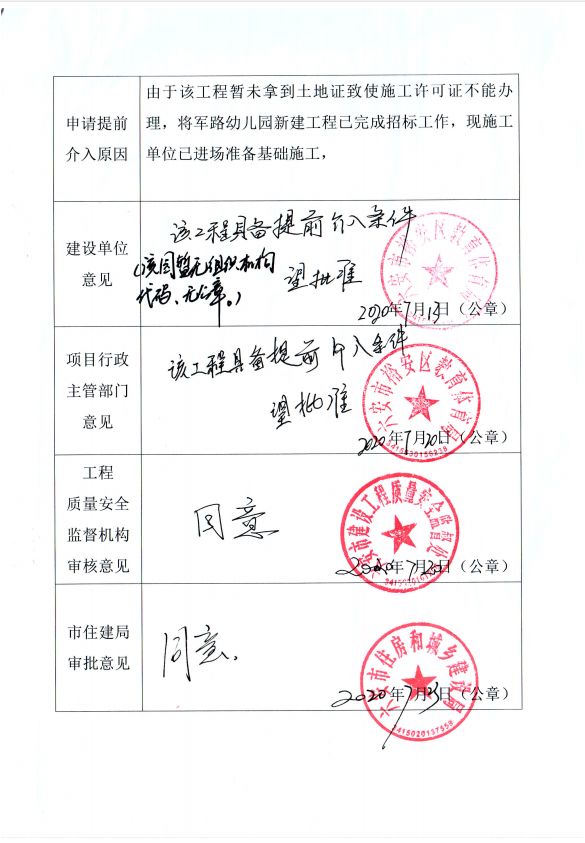 将军路幼儿园建设工程提前介入质量安全监督申请表