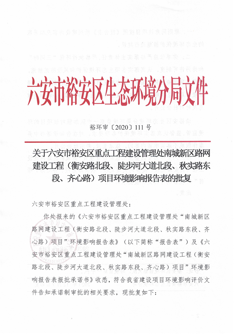 关于南城新区路网建设(4条路)项目环境影响报告表的批复