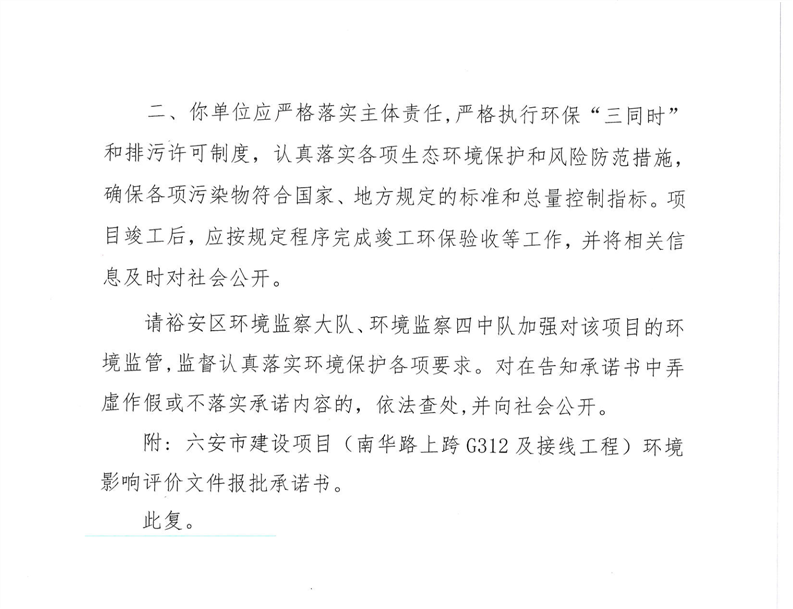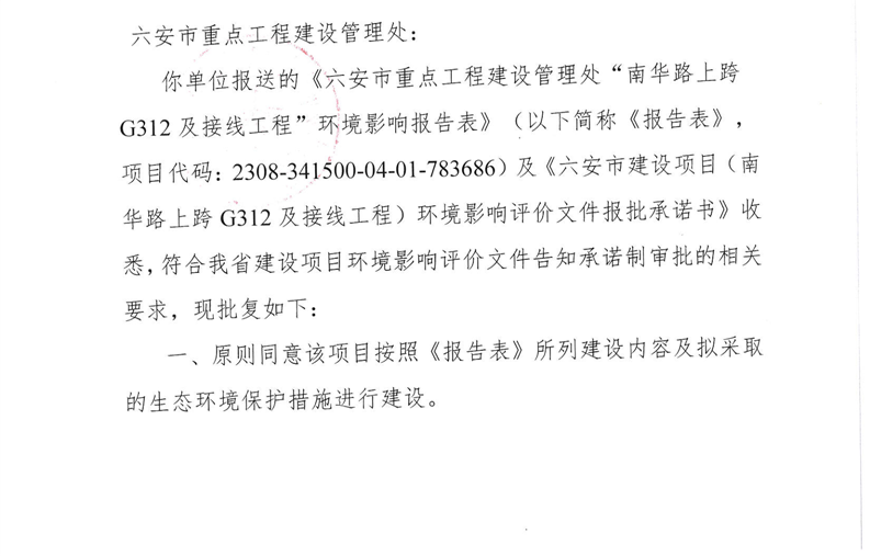 关于六安市重点工程建设管理处南华路上跨G312及接线工程环境影响报告表的批复