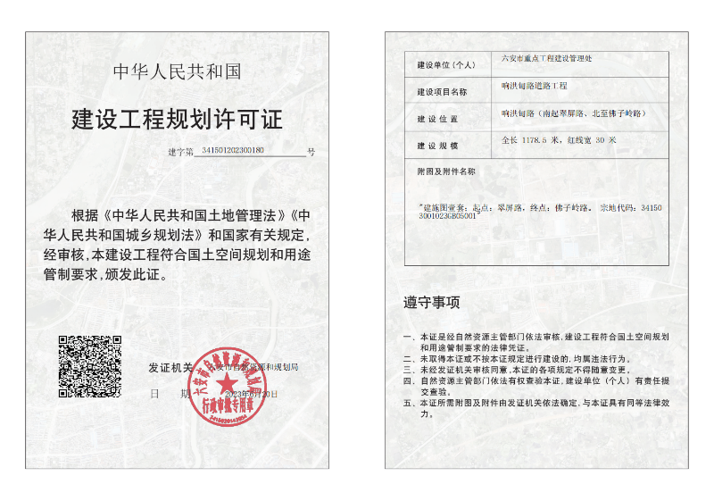 响洪甸路(翠屏路—佛子岭西路)道路工程规划许可证