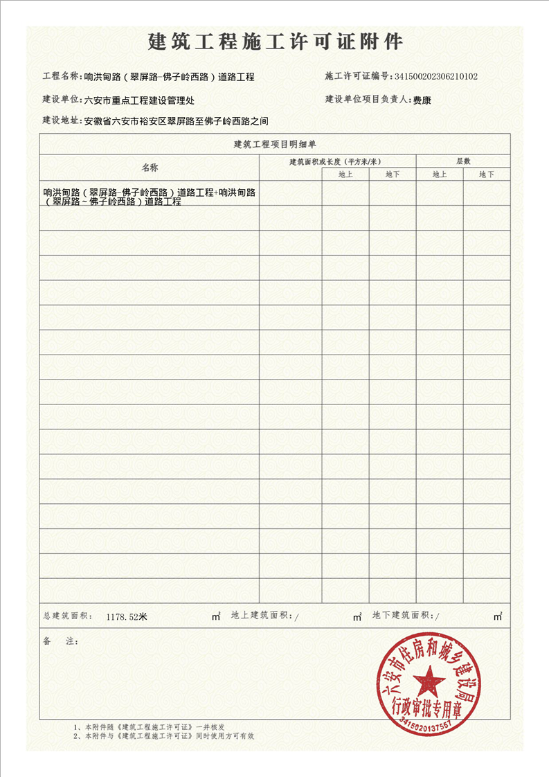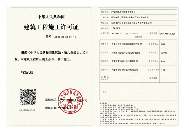 响洪甸路(翠屏路—佛子岭西路)道路工程施工许可证