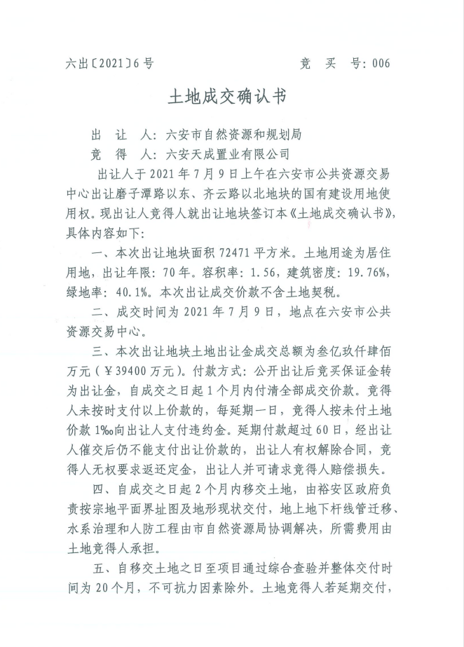裕安区嘉和人家安置小区项目建设地块土地成交确认书