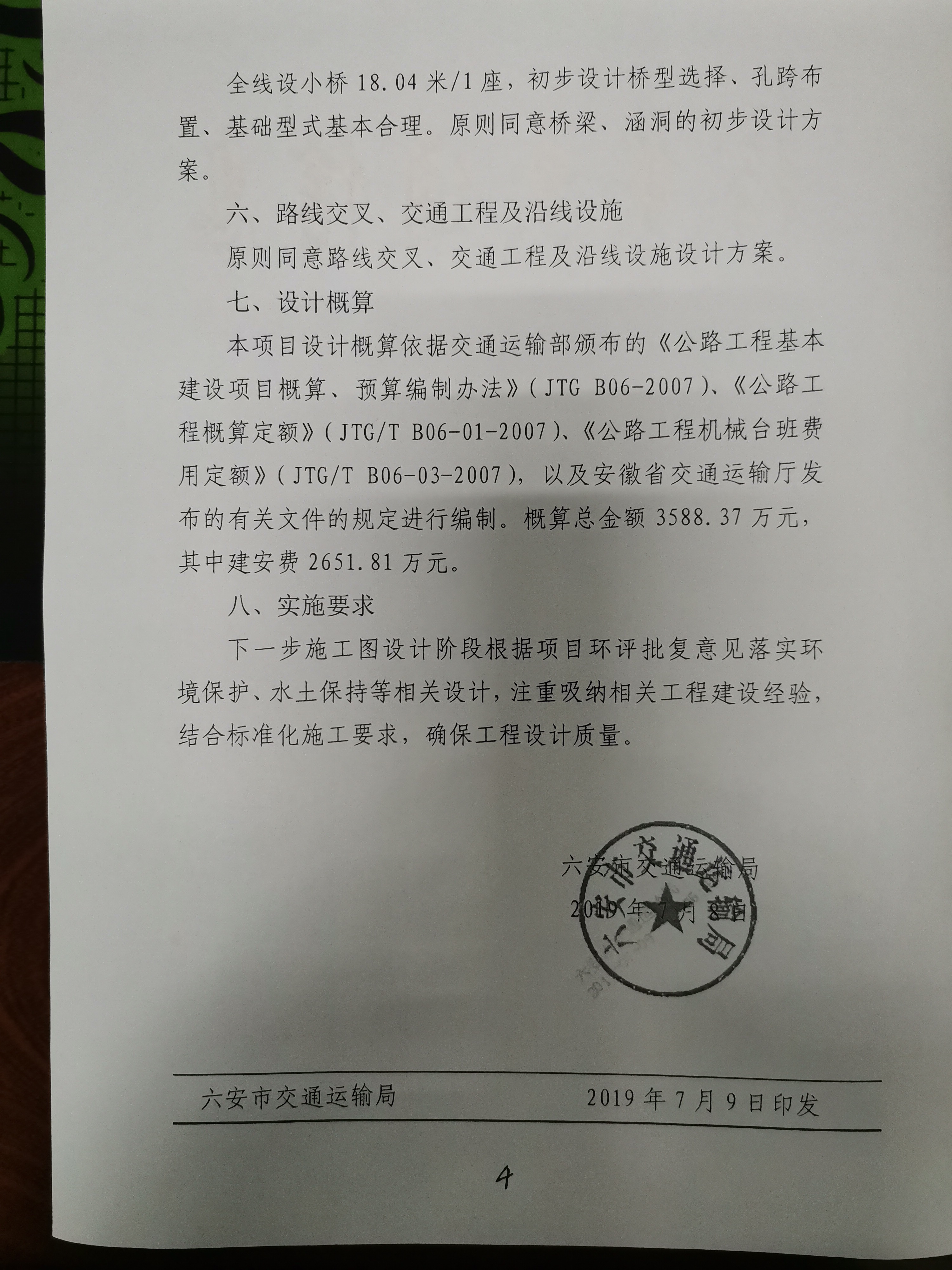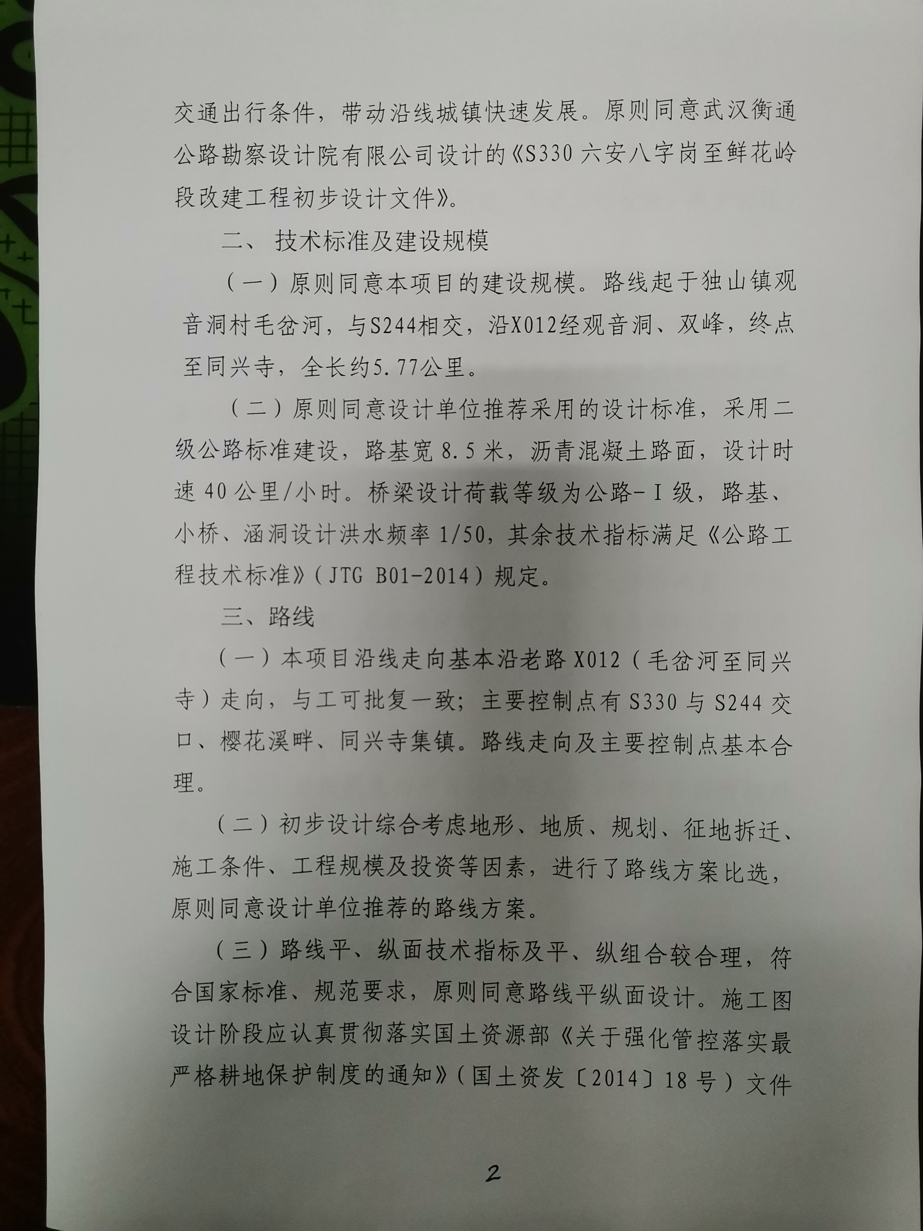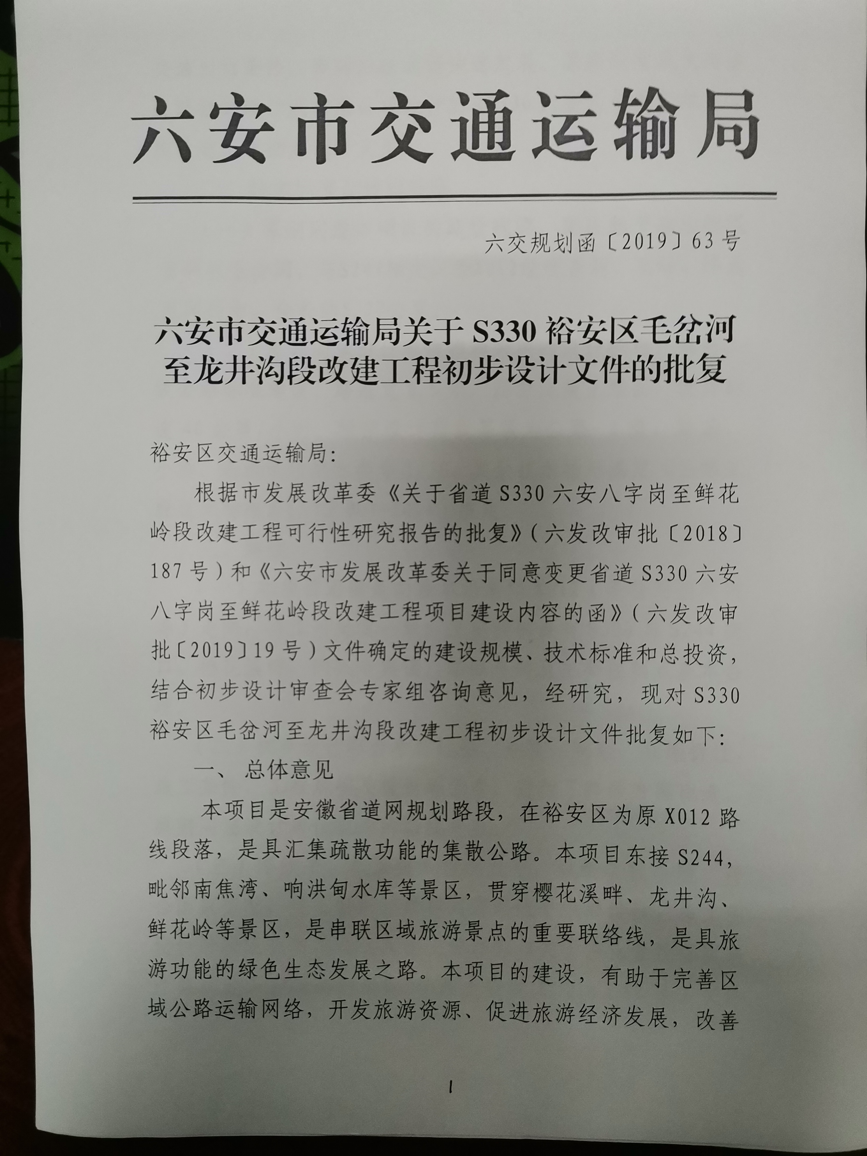 六安市交通运输局关于S330裕安区毛岔河至龙井沟改建工程初步设计文件的批复