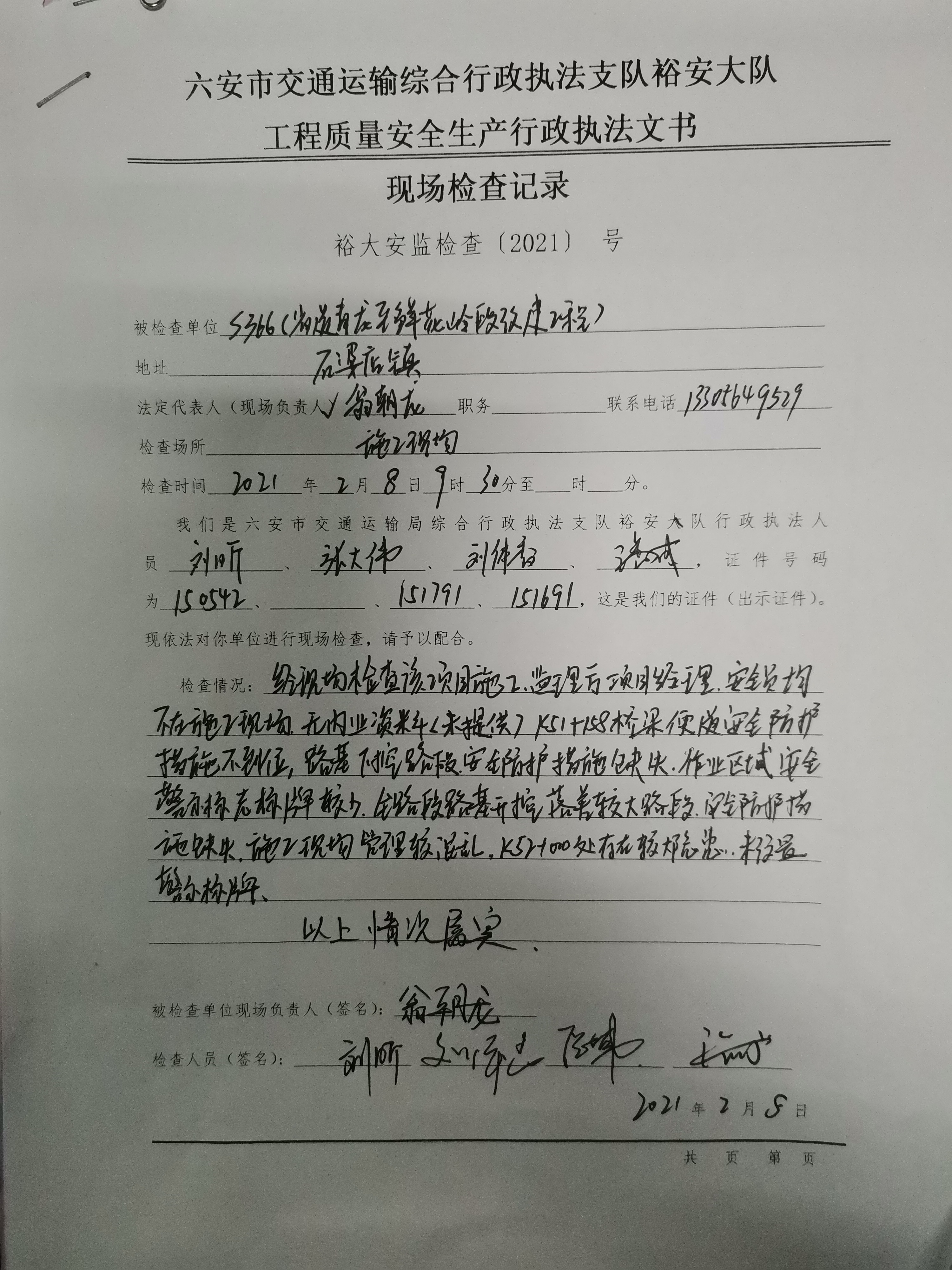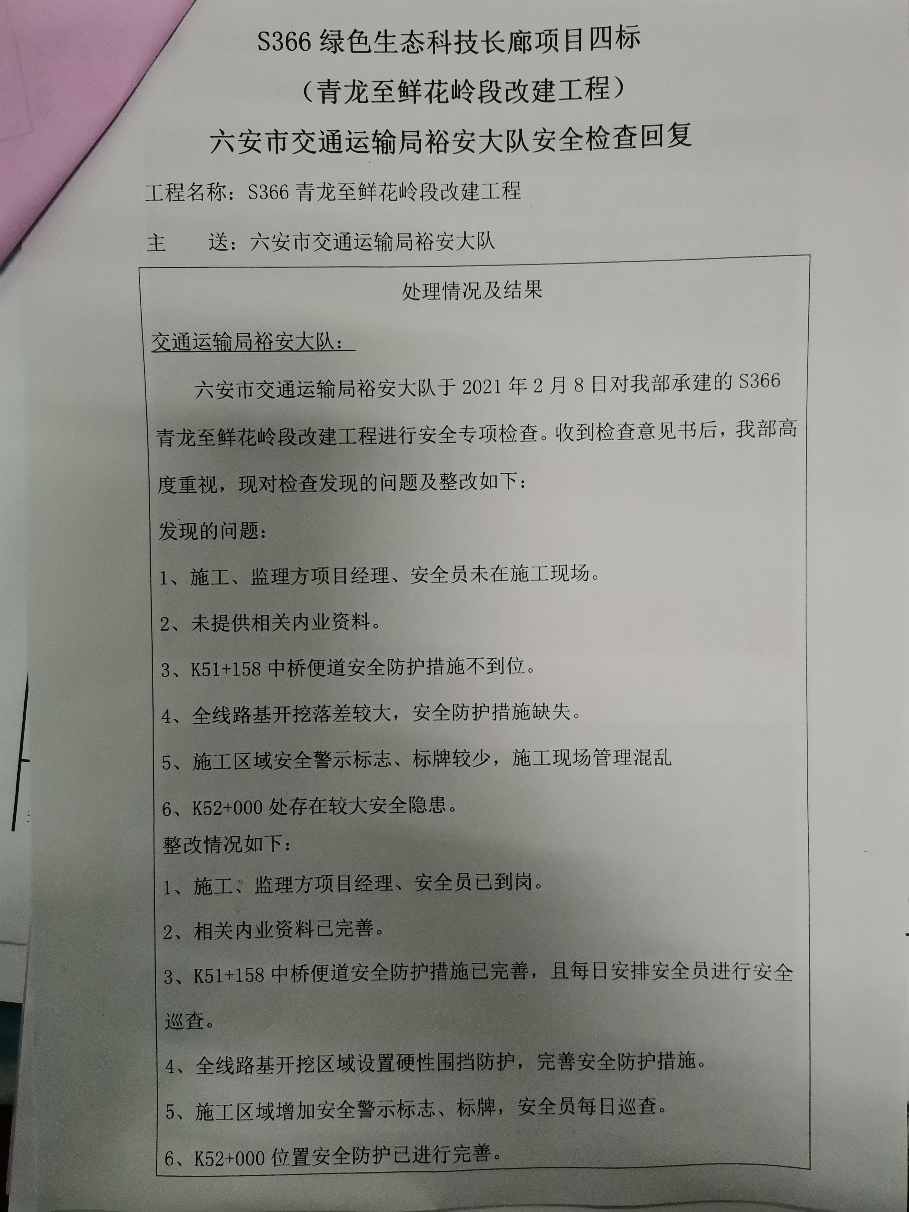S366省道青龙至鲜花岭段改建工程安全生产监督检查