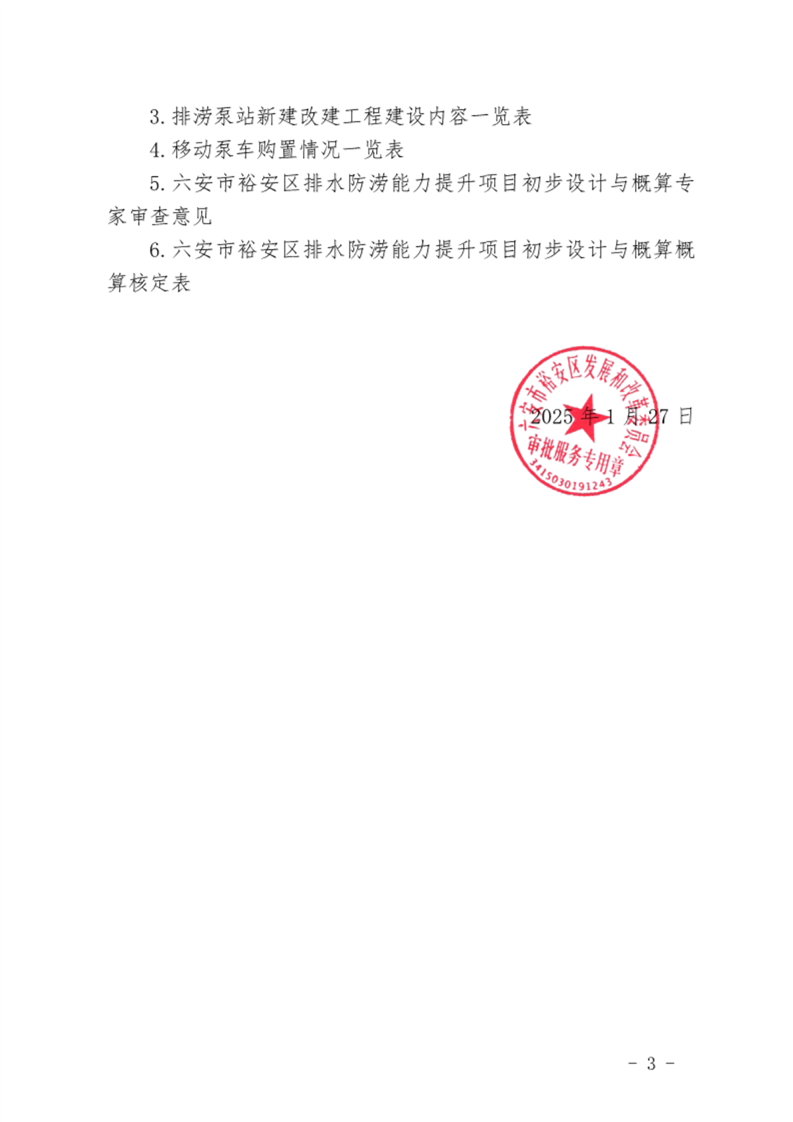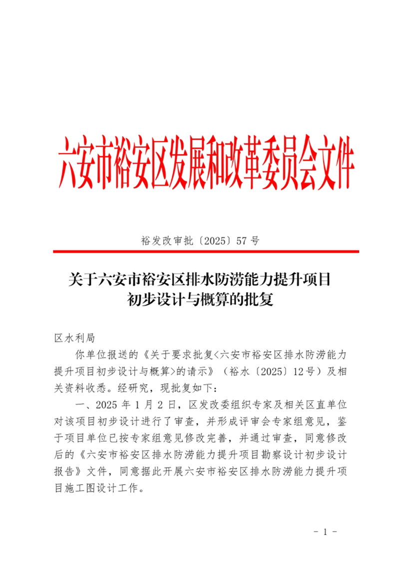 裕安区排水防涝能力提升项目初步设计与概算的批复