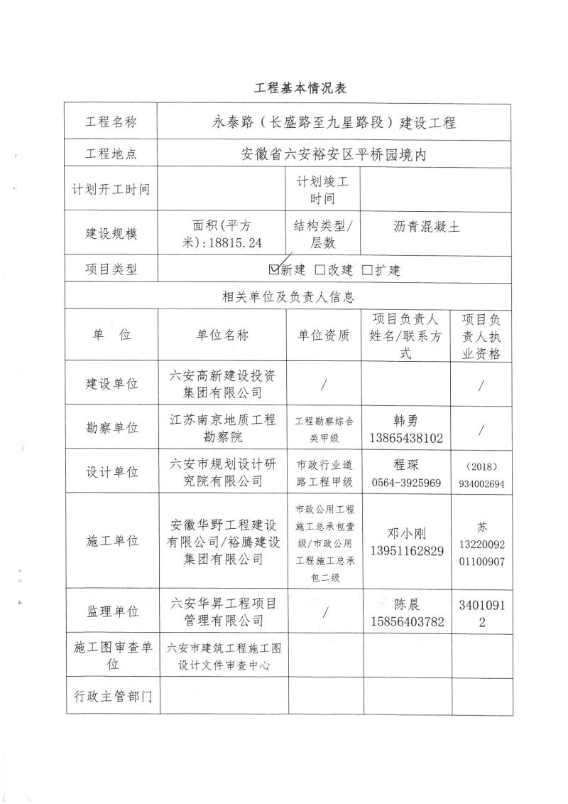 永泰路(长盛路-九星路段)建设工程质量安全监督信息