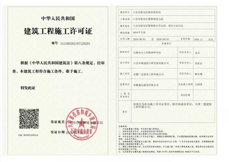 紫荆巷幼儿园建设工程施工许可证