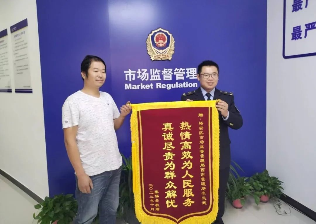 近日,消费者陈先生带着印有“热情高效为人民服务、真诚尽责为群众解忧”的锦旗来到裕安区市场监管局西市所,对该所积极维护自己合法权益、及时挽回18550元经济损失表示感谢。