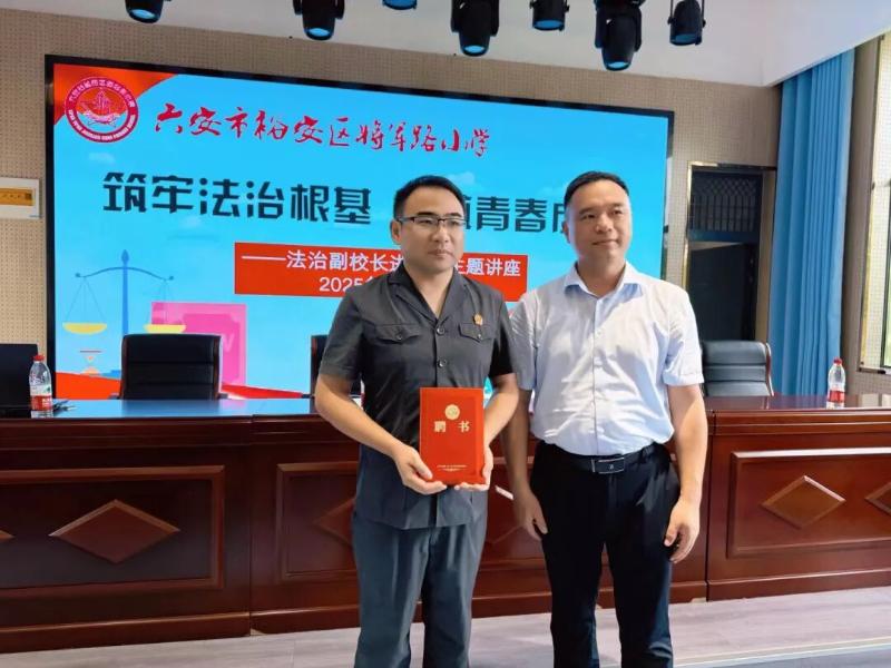 杨家国校长为六安市中级人民法院民一庭副庭长丁瑞祥颁发法治副校长聘书。丁副校长表示,将以责任感投入工作,结合学生认知规律,用案例教学、情景模拟等方式开展法治活动,助力学生提升法治素养。聘书颁发标志着学校法治教育迈入新阶段,汇聚了专业护航力量。