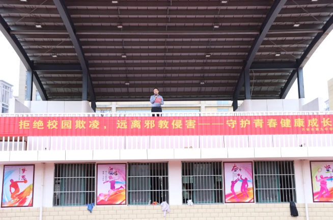 9月22日清晨,六安九中全体2025级师生齐聚操场,以“拒绝校园欺凌,远离邪教侵害”为主题,举行升旗仪式暨法治教育宣讲活动。通过法律宣讲、学生倡议、集体宣誓等环节,为学子们织密“安全防护网”,让青春在法治与善意中健康成长。