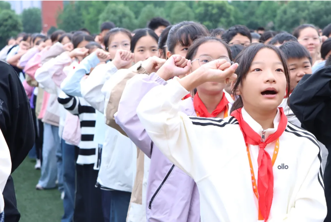 少年发声,以誓言守护青春纯净。七2中队学生代表王锐馨以同龄人视角分享对“欺凌与邪教”的认知。她细数身边可能存在的欺凌现象,揭穿邪教“伪装套路”。随后,王锐馨同学发出倡议,并带领全体同学举起右拳宣誓。铿锵的誓言回荡在操场,少年们眼中的坚定,成为校园里最动人的“安全承诺”。