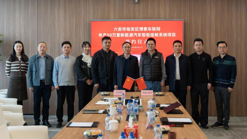 在博泰车联网科技(上海)股份有限公司,董永来与企业负责人座谈,了解公司业务开展情况,现场见证裕安博泰车联网年产50万套新能源汽车智能座舱系统项目招商、投资、代建回购协议签约。博泰车联网科技(上海)股份有限公司主营车联网、汽车电子设备及集成电路的设计与研发,为上海市独角兽企业,目前拥有五菱、吉利、奇瑞、哪吒、理想、东风、岚图、红旗等23个车企供应商资格,业务覆盖智能座舱产品研发、生产制造及运营服务的各个方面,为智能座舱垂直一体化业务发展的领军企业。